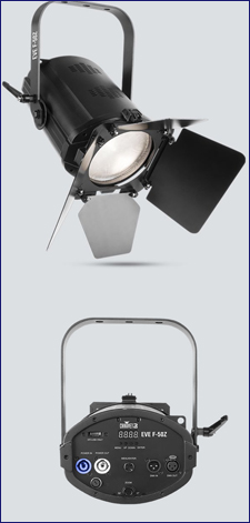 EVE F-50Z is an LED Fresnel fixture that shines a soft-edged, warm white spot and features D-Fi™ USB compatibility for wireless master/slave or DMX control. Manual zoom gives you the flexibility to project from any distance. You can operate EVE F-50Z in standalone mode eliminating the need for DMX control and you can save time running extension cords by power linking multiple units.
