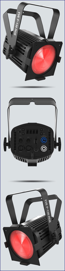EVE P-130 RGB is a robust RGB wash light designed for mobile lighting entertainers. Interchangeable magnetic lenses are included to alter the beam to desired angles. EVE P-130 RGB has a sturdy cast aluminum housing that provides extra strength without added weight. D-Fi USB compatibility is also onboard providing the option for wireless master/slave or DMX control. Its fanless design ensures 100% silent operation and the unit’s high-frequency LED dimming offers flicker-free operation perfect for video use. EVE P-130 RGB has a built-in gel frame holder and 6¼-inch accessory slot to hold barn doors. Flexible control connection options are onboard with both 3- and 5-pin DMX connectors. PowerCON®-compatible power input/output connections allow secure power linking.