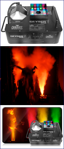 Make a statement with Geyser — a unique effect fogger that adds a touch of drama to any performance. This powerful fogger blasts a vertical stream of safe, water-based fog while simultaneously illuminating it with high-power LEDs. A combination of red, green and blue LEDs allows you to easily mix the perfect color to illuminate the fog.